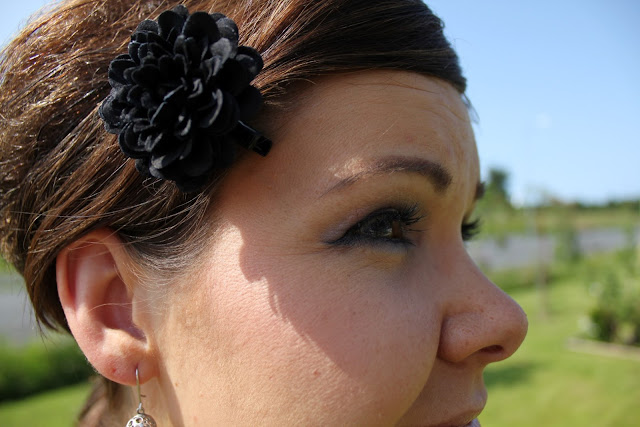 Mekko sopi täydellisesti helteiseen päivään. Tukka meni kunnon tupeerauksella palloksi takaraivolle unohtamatta kukkakoristetta. Loput tukasta laitoin vaan rennolle ponnarille ja silmät saivat kissamaisen meikin.
